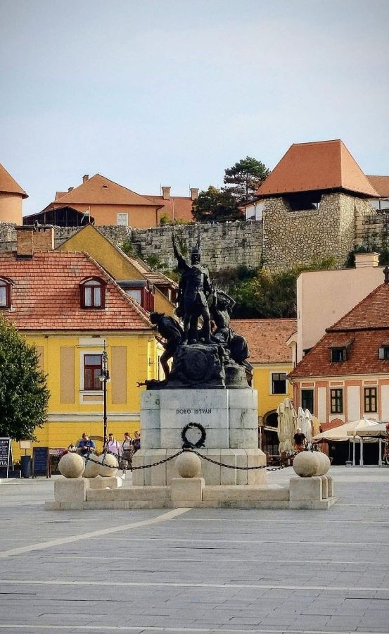 Balogh János főhadnagy már 1882-ben Eger polgármesteréhez intézett levelében kezdeményezte az 1552. évi diadal emlékére a Dobó szobor felállítását. Bár a képviselőtestület elfogadta a javaslatot és bizottságot állított fel a megvalósítás érdekében, az még váratott magára. 1901-ben Gárdonyi Géza felhívására egri és országos adakozás indult a szobor létrehozása érdekében. Stróbl Alajos 1905-ben fogadta el a felkérést a szobor elkészítésére. Az elkészült alkotás a tér vár felé eső végében lett elhelyezve. Az avató ünnepségére 1907. augusztus 18-án került sor. A kivont kardú Dobó Istvánt, a térdre ereszkedve követ dobó egri nőt, s a kardját épp kirántani készülő Mekcseyt ábrázoló szoborcsoport, hátterében a várral, a város képévé vált.