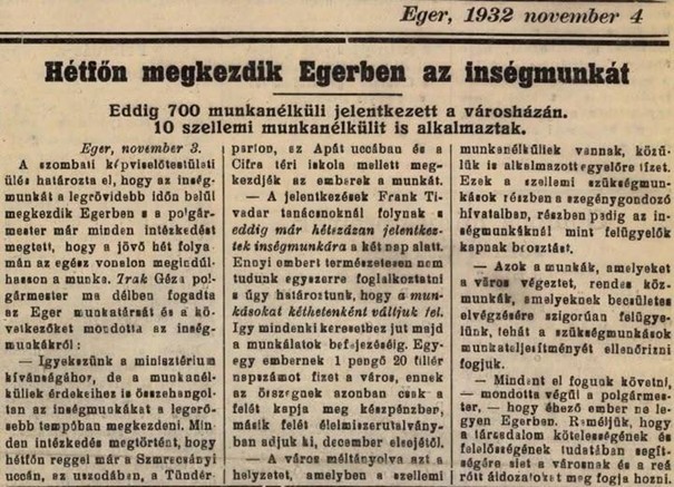 A nagy gazdasági világválság után Egerben ínségmunkát szerveztek a szegények részére 1932-ben!
