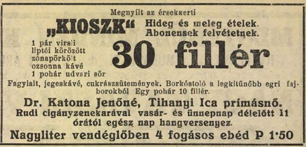 Egernek vendéglői, kivéve a Koronát, mind házak közé ékeltek, zárt levegőjűek. Messzebb útra pedig nem szívesen vállalkoznak a pihenni, szórakozni kívánók, kivált nagy melegben. Ezért volt azután szükségszerű követelmény az érsekkerti Kioszk megépítése. S azért van jövője annak a szép épületnek, meiy az Érsekkertnek erdőszerű zöldjéből kellemesen világít ki, s mely becsületére válik tervezőjének és építőjének, Márkus Béla mérnöknek.