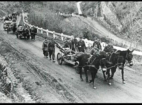 112/1.német hegyi tüzér zászlóalj (része a 3. Hegyi hadosztálynak) menetben Répáshuta felé. Ez az egység részt vett a Bükkszentkereszti, Répáshutai és a Bélapátfalvai harcokban, homonna tetőn súlyos harcokat vívott a 206. Szovjet lövész hadosztály erővel. Kép a lusta völgyi elágazásnál készült.