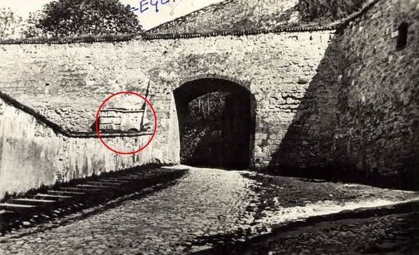 (1952-es felvételen, a nagykapu mellet bal oldalon, a kerítésen túl látszik a befalazott kiskapu, piros körrel jelölve, ami egy 1965-felvételen már szabadon járható és a falazat is át lett helyezve!)