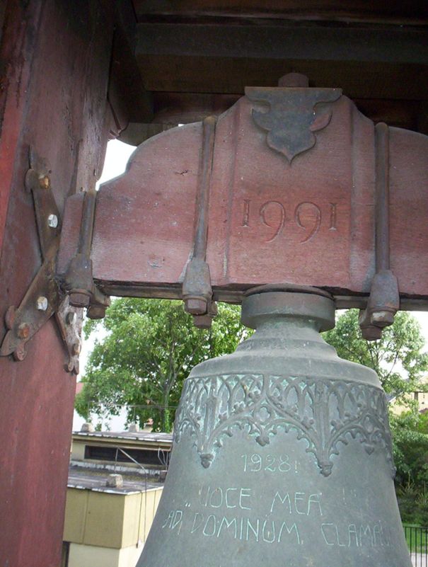 Két évvel ezelőtt fényképeztem a harangot egy olyan létráról, ami éppen csak, hogy felért a harangig és este a számítógépen visszanézve láttam egy vésetet a körbe futó szecessziós füzér fölött, ami így szól: Josef Pfundner WIEN 1928.