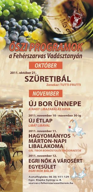 FEHÉRSZARVAS VADÁSZTANYA ÉTTEREM Eger, Klapka György u. 8. Megnyitotta kapuit 1969. szeptember 6-án Egerben a Fehérszarvas Vadásztanya Étterem. Balogh György egri építészmérnök készítette az üzlet terveit. A megnyitáskor az étterem mellett a pincerendszer egyik ágában borozó is működött, majd később azt a rész megszüntették.