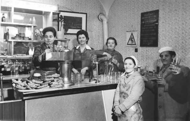 A fotón, az egri Zöldhordó italbolt belső részlete látható, a bolt munkatársaival és törzsvendégeivel. Középen a pult látszik, a sörcsapokkal, pohármosóval és ital mellé kínált harapnivalóval. A pult mögött a személyzetet alkotó hölgyek. A pult mögötti falon balra, a függöny mellett, a működési engedély és panaszkönyv látható. Középen az üvegezett vitrinekben, a polcokon üvegpalackok és néhány konzerv szolgáltatta a dekorációt. A jobb oldali falon lévő táblán, a kiszolgálással kapcsolatos panaszok intézésének módjáról kaphattak felvilágosítást a vendégek. A boltot az Egri Vendéglátóipari Vállalat üzemeltette a Zalár utcában.