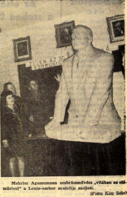 A tervek szerintt ötmeteres lesz ez a Lenin-szobor, melyet a jövő esztendő áprilisában állítanak majd - fel a Gárdonyi téren, vörös gránitból készült (a gipszmodell csupán kétharmada a leendőd nek), és az egész kompozíció igyekszik összhangba kerülni a jelenlegi, és a későbbi — ez már városrendezési feladat a környezettel. Nem teljes alakjában ábrázolja Lenint. úgy áll, mint hajdan a szónoki emelvényen, s a térplasztika követelményeit is követi: egyaránt impozáns a városba érkezőnek és — a majdani felvonulóknak is. Az a gondolat fogalmazódik benne, amire maga a művész, Makrisz Agamemnon is utalt: úgy lássa mindenki, ahogy ma Lenin az emberek tudatában él, tehát ahogyan a leendő publikum képviselői, a megrendelő, lelkes munkások is kérték az első megbeszélésen.