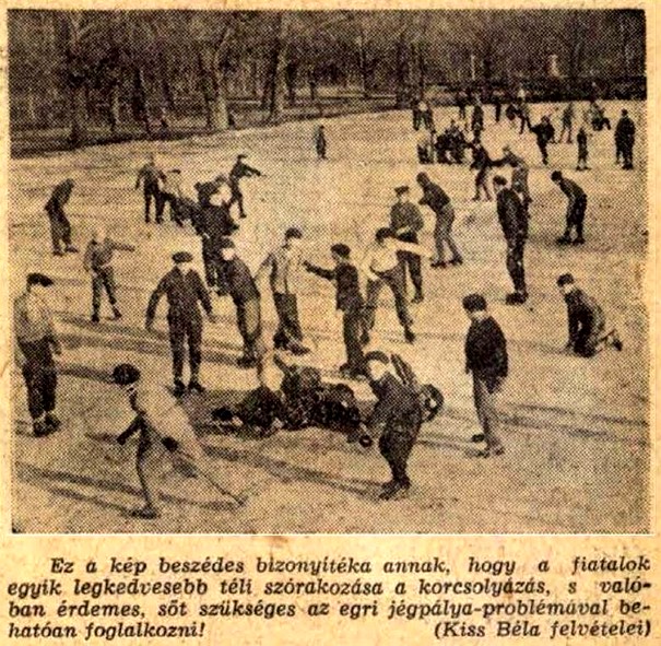 A vidáman szállingózó hó néhány pelyhe megmegakad a mellettem haladó kis úttörő szempilláin, pirosán fagyott orrocskáján. Nagyokat csúszik a fagyos úton és így előnnyel érkezik, de a népkert kapujában megvár. Áthaladunk a zúzmarától terhes fák alatt és önkénytelenül fütyörészni kezdi a korcsolyapályáról idehallatszó keringőt. A kis úttörő ugyan hamisan, de a vállán lévő korcsolyák csilingelik hozzá a taktust, mint apró kis zenekar, tam, tam, tam. Néhány pillanatig megállunk az Eger-patak hídján, hogy megcsodáljuk a patakra hajló füzek ezüst hó koronáját, de a pályáról hallatszó élénk zsivaj és az „Aranyezüst-keringő“ erősödő hangja közelebb csalnak a korcsolyapályához. Csodálatos tarkaság fogad. Élénkpiros, búzakék, mérgeszöld pulóverekben, melegítőkben siklanak, rohannak, bukdácsolnak a jégen. A vakációzó vidám fiatalok korcsolyái villannak, arcukat pirosra csípi a hideg, nevetésük túlharsogja a zenét is. Kis barátom a kezdők jellegzetes imbolygásával közeledik felém. Korcsolyája ki-kibicsaklik, sóváran néz az előtte ellibbenő kislányra, akinek bársony szoknyácskája minden mozdulatnál pereg, mint az orsó. Amott az öt év körüli kisfiú veszélyezteti a felnőtteket, fittyet hányva az iránynak, fel-felbuktatva néhány ügyetlen kezdőt, mint csúfondáros kis manó siklik tovább. Távolabb két felnőtt keringőzik a belső körön! Sok nézőjük akad. Tizenhat év körüli fiú egy szőke kislánnyal „bognizik”, komolyan beszélgetnek arról, milyen jó is lenne, ha már nagyobbak lennének. A fiú mérnöknek készül, a kislány még nem döntötte el, hogy mi szeretne lenni. De a komoly beszélgetés nemsokára vidámabbra fordul, megbotlanak egy hóbuckában és egy pár perc múlva már kacagva verik le egymásról a havas foltokat. A téli nap bágyadtan bukik le a Népkert fái mögött. Erősen sötétedik, kigyúlnak a lámpák és a szállingózó hó, mint ezernyi ezüst kristály telepszik a korcsolyázók vállára, hajára. Későre fordul az idő. Kis barátom lecsatolja a korcsolyát és a ropogó, fagyos úton hazafelé indulunk!