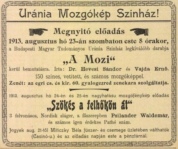 Az Uránia — a mai Vörös Csillag mozi előde — zsúfolt nézőtér előtt, 1913. augusztus 23-án vetítette a bemutató előadást. A mozi ünnepélyes műsorra] látta vendégül első közönségét. Az országos hírű Egri Polgári Dalkör énekszámaival tarkított programban Károly János, a mozi egyik tulajdonosa és az egri Keresztény Iparoskör elnöke rövid bevezető ismertető előadása után stílszerűen egy Uránia-darabot vetítettek: A mozi címűt, dr. Hevesi Sándor és Vajda Ernő 150 szines állóképpel tarkított, számos rövidfilmből álló összeállítását.
