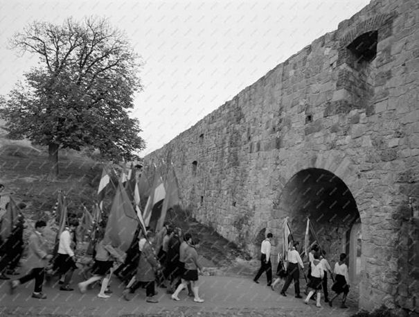 Eger, 1965. október 18. Ünneplő egyenruhába öltözött úttörők vonulnak a várvédők 1552 évi győzelmének évfordulóján rendezett az ünnepélyes csapatgyűlésen, az egri vár bejáratánál. A Tanárképző Főiskola Gyakorló Általános Iskolájának Bornemissza Gergely Úttörő Csapata fontosnak tartja a város történelmi hagyományainak ápolását, ezért minden év október 18-án ünnepélyes csapatgyűlésen, a várudvarban emlékeznek meg az egykori török seregek ellenn aratott győzelemről. Megkoszorúzták a hősök emlékműveit, majd a vár történetét idéző műsoron vett részt az iskola 400 úttörője és számos érdeklődő. MTI Fotó: Kunkovács László