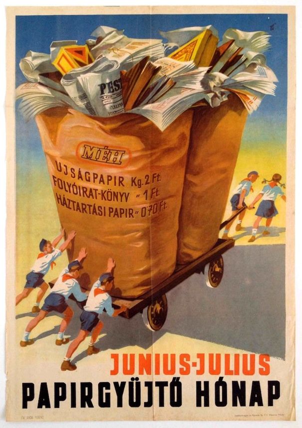 „Gyüjtsd a papírt és a fémet ezzel is a békét véded.” Plakáton az úttörőket papírgyűjtésre ösztönzik.