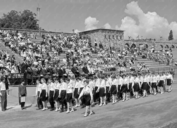Eger, 1964. május 31. Kisdobosok, úttörők és KISZ (Kommunista Ifjúsági Szövetség) tagok vonulnak a kisdobos, úttörő és KISZ (Kommunista Ifjúsági Szövetség) taggá avatási avatási ünnepségen a városi stadionban. Az eseményen 1200 kisdobos, úttörő és KISZ tag tett esküt. MTI Fotó: Bajkor József