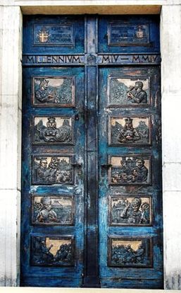 Jobb oldalon: Jézus bevonulása Jeruzsálembe, Szent Mihály legyőzi a sátánt, Szent Péter szabadulása a börtönből, Jézus és a hozzá siető gyermekek.