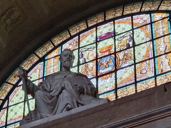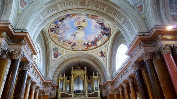 Mielőtt belépnénk a háromhajós, kereszthajós, kupolaboltozatos monumentális épületbe, a lépcsőzet két oldalán megcsodálhatjuk Marco Casagrande szobrait. Elől Szent István koronával és Szent László csatabárddal, mögöttük Szent Péter kulcsot és Szent Pál kardot tart a kezében.