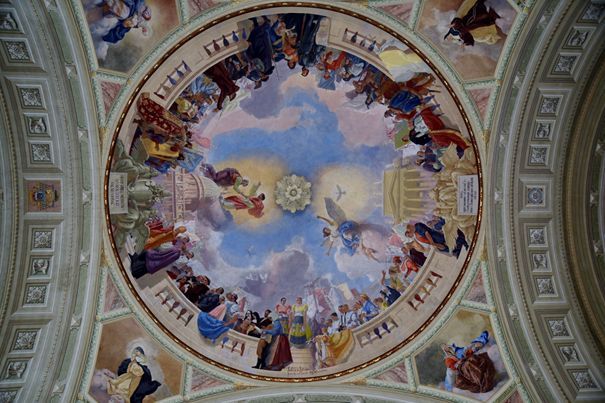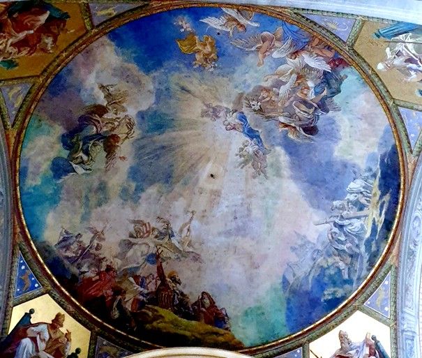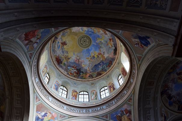 A nagykupola. Mérete: 40 m magas, átmérője 18 m. Csegelyein a 4 evangelista látható, a hozzájuk kapcsolódó attribútumaikkal együtt. Máté az angyal, Márk az oroszán, János a sas, Lukács az ökör társaságában. A kupola ablakai között a 12 apostol freskóképe látható.