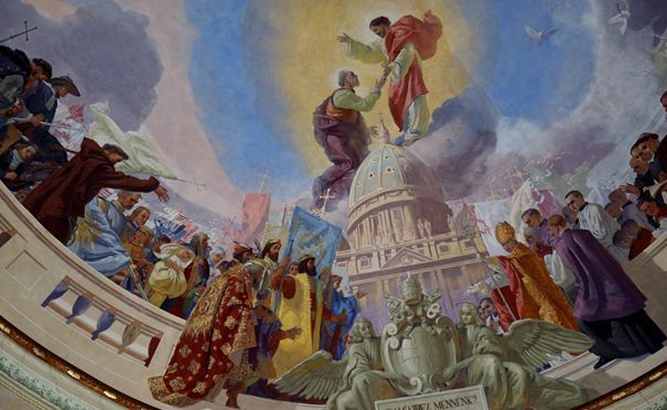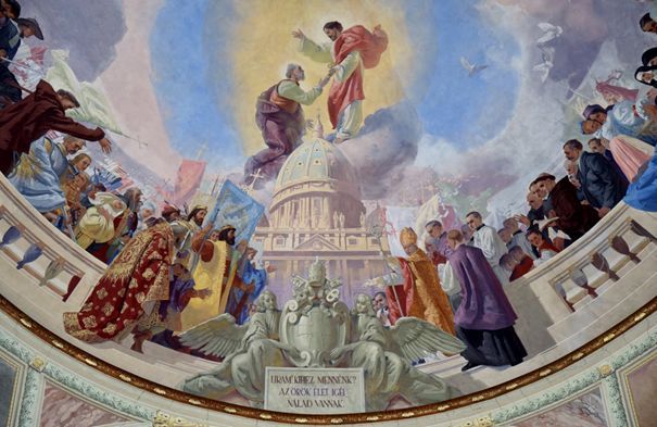 A Szent Péter Bazilikától jobbra Czapik Gyula érsek, a freskók mecénása vezetésével felsorakoznak a népviseletbe öltözött hívek is. Czapik érsek mellett áll Bordás kanonok, a bazilika festésének irányítója. Maga a festő is látható sötét overállban, sapkával a kezében.