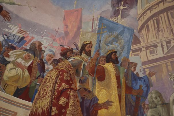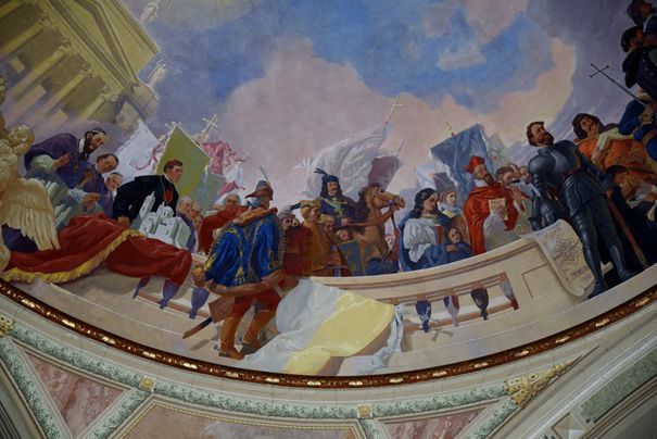 Felsorakoznak a magyar történelem jelentős alakjai: Szent István király aranyszínű koronázó palástban, felesége Gizella királyné, tragikus sorsú fiuk Szent Imre herceg, nevelője Szent Gellért püspök, mögöttük Szent László király, IV. Béla és lánya Szent Margit, Szent Erzsébet rózsákkal, Hunyadi János a törökverő, két gyermekével, Mátyással és Lászlóval, Tomori Pál kalocsai érsek, Zrínyi Miklós a szigetvári hős, Dobó István a hűség, a hazaszeretet, az elszánt küzdeni akarás jelképét megtestesítő egri vár kapitánya. Pázmány Péter esztergomi érsek bíbornoki ruhában, a három kassai vértanú mellett Zrínyi Ilona, majd lóháton II. Rákóczi Ferenc.