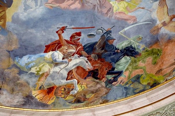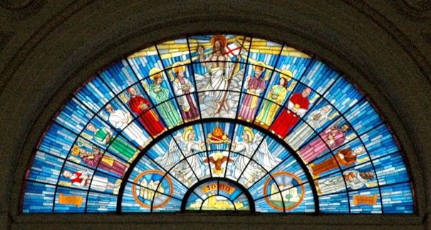 A kupola oszlopközeiben lebegő szárnyas kerubok láthatók, szimbolikus tárgyakkal a kezeikben.
