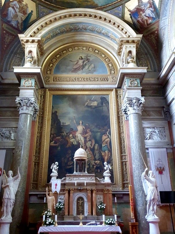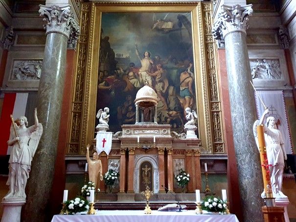 A főoltárkép Szent János evangelista forró olajban történő kivégzési próbálkozását, jelenetét ábrázolja, Josef Danhauser (1805-1845) bécsi festő alkotása 1835-ből. Halálra ítélték, forró olajba mártották, de megfiatalodva szállt ki az olajból. A bazilika legművészibb, legértékesebb festménye.