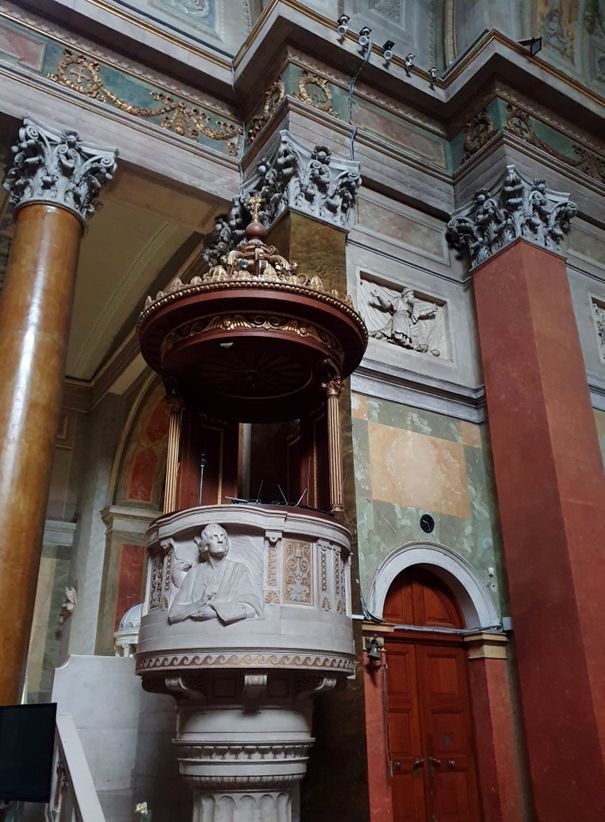 Szószék. A Szent Mihály oltár mellett áll, az 1910-ben készült márvány szószék. A szószék oldalán János apostolt láthatjuk, Damkó József domborműve. A hangvető faragványokkal díszített.