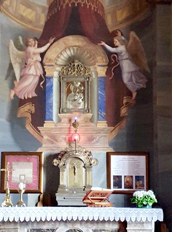 Az oltárkép fölött az áldást osztó Megváltót láthatjuk.