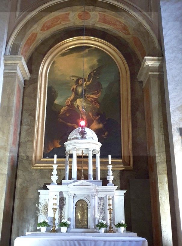 A bal oldali mellékhajó végében van a carrarai márványból készült Szent Mihály oltár, (1894) Schikedanz Albert készítette. Az oltárképet Michelangelo Grigoletti festette, Szent Mihály arkangyal győzelme a gonosz fölött.