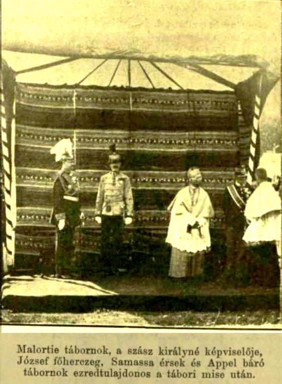 A legszebb sikerrel folyt le Egerben az-az örömünnep, melyet a 60-ik gyalogezred tisztikara az ezred fönnállásának 100-ik évfordulója alkalmából és egyszersmind azon díszes zászló fölavatására rendezett, melyet Ő Felsége az ezrednek ajándékozott. A jubileum, mint már lapunk előbbi számában is említettük, a gyakorlótéren tábori misével kezdődött, a melyet dr. Samassa József egri érsek mondott fényes segédlettel. Mise alatt a katonai méltóságok, nevezetesen József főherezeg, az ezred volt zászlóaljparancsnoka, báró Malortie Tivadar tábornok, a szász királyné képviselője, báró Appel János ezredtulajdonos, lovassági tábornok, Fabiny Lajos altábornagy, kassai hadtestparancsnok, továbbá Bittner Vilmos, szokoláczi Boxichevich Lajos, Englisch Popparich Alfréd tábornokok az imasátor jobb oldalán, a polgári hatóságok fejei pedig, névszerint Kállay Zoltán főispán, Hellebronth Béla alispán és Jankovich Dezső polgármester a baloldali részében foglaltak helyet. A tábori mise után nyomban következett az új zászló fölszentelése. A hófehér selyemből való zászlót, melynek egyik oldalára színes Mária-kép, a másikára a kétfejű sas van hímezve, a zászlótartó kibontotta, mire báró Malortie Tivadar, a zászlóanyául fölkért szász királyné képviselője, az ezred arczvonala előtt álló lovag Schwartz Henrik ezredparancsnok elé lépett, s pár szó kíséretében átnyújtotta neki a szász királyné által ajándékozott gyönyörű zászlószalagot. A kék selyemből való, s moár szegélyű kettős zászlószalag külső oldalának két szárnyán pompás aranyhímzésű cser- és babérágak között ama csaták évszámai vannak feltüntetve, amelyekben az ezred különösen kitüntette magát és pedig Winterthur 1799, Aspern 1809, Lipcse 1813, Lyon 1814, Les Rousses 1815, Solferino 1859, Königgratz 1866, Brcka 1878. A szalag egyik végébe a szövetségczímer, a másikba a szász királyné czímere van beszőve. A szalag hátsó két szárnyának hosszában nagy aranyozott betűkkel ez a német felírás olvasható: 1798. A százéves jubileumra. — 1898. Karolina, Szászország királynéja. A zászlószalag az új zászló nyelére föltűzetvén, az ezred régi zászlaja alatt arczéllel az imasátor elé vonult, s egy század a Muzsik őrmester kezében tartott új zászlóval az imasátor elé lépett, miközben az ezred összes dobosai a „templomba hívó” jelt verték. Azután Muzsik őrmester az új zászlóval az oltár előtt féltérdre ereszkedett, s a tisztek kardot rántva, imához vezényelték a legénységet. Ezt az érdekes jelenetet képben is bemutatjuk, úgyszintén azt is, a midőn a két zászlótartó az ezred régi és új zászlajával egymás mellett áll. A zászlók előtt való tisztelgés után az új zászló megáldása következett, s annak végeztével Samassa érsek emelkedett szellemű hazafias beszédet tartott a legénységhez. Vitézek, — szólt többek közt, — hordjátok e zászlót magasan a haza dicsőségére. Hordjátok magasan a vallás védelmében, mert a társadalom talpköve a vallás és a tiszta erkölcs. Hordjátok magasan, midőn a koronás apostoli király kívánja, mert ő az egész nemzet fölségének képviselője. Hordjátok magasan a törvény szentségének oltalmában, mert csak az ez iránti tisztelet árnyékában virulhat a haza. Hordjátok végre magasan, ha azt a haza védelme kívánja, mert e kívül nincs számunkra hely, itt élnünk, itt halnunk kell! . . . A hazaszeretet magasztos érzelme, a nemzeti becsület hatalma lengesse tehát e zászlót mindvégig, s vezesse azt a hozzája esküdött vitézekkel együtt becsület és diadalmak közt, s a mindenható Isten oltalma alatt mindig első sorban oda, hol az e zászlót követő harczfiak a királyi trón, s nemzeti létünk és alkotmányos szabadságunk biztosságát, ha kell, önfeláldozással is megmenteni, vagy szilárdítani hivatva leendnek. Az Atya, Fiú és Szentlélek áldása szálljon e zászlóra és az ahhoz esküdött vitézekre! Ezután a zászlóaljak négyszögalakban álltak föl azon asztal körül, melyen a zászlószegek voltak. Az első három szeget Samassa érsek verte be a zászló nyelébe Isten tiszteletére, majd báró Appel ezredtulajdonos egyet a király lovag Schwarcz Henrik ezredparancsnok pedig az ezred nevében. (Ezredtulaldonos: Osztrák-Magyar Monarchia hadseregében altábornagy, vagy magasabb rangú főtiszt, fejedelmi személy stb., kinek nevét az ezred viseli, s kinek joga van az alárendelt tiszteket a kapitányokig bezárólag kinevezni.)