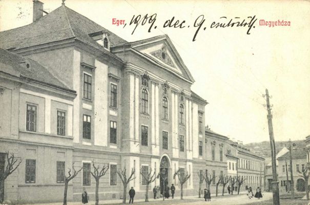 A 18. század közepéig a hivatali ügyintézés a tisztségviselők házában történt. A megyegyűléseket Gyöngyösön tartották, ahol a főnemesség kuriális házzal rendelkezett. 1747 decemberében Heves vármegye közgyűlése megszavazta, hogy a megye állandó székházát felépítik. Barkóczy püspök-főispán meggyőzte a megyét, hogy vásárolják meg a Fekete Sas fogadót és annak helyére építsék fel a székházat. Az építési felügyelőnek Szentgyörgyi Jánost választották meg, s meg is kezdték az építkezést. Építésze Gerl Mátyás volt. A kovácsoltvas-díszeket Fazola Henrik készítette.