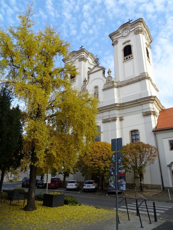 Amikor a szomszédos rendház felépítése részben befejeződött, a rend fő pártfogói, köztük Barkóczy Ferenc akkori kanonok, támogatták a templom mihamarabbi felépítését is. Erdődy püspök 1736. augusztus 2-án elhelyezte a templom alapkövét. A szentély hét éven keresztül épült. 1744-ben a felépített szentélyt deszkákkal kapcsolták a mecsetből átalakított régi templomhoz, és így egy épületet hoztak létre. 1748 végére elkészült a templom és a rendházhoz vezető folyosó fala. 1749-ben felépült a templom fala is. 1750 februárjában a hajó építését kezdték meg. 1753-ban rakták fel a tetőt és az aranyozott keresztet a hajó tetejére. A boltozat vakolása 1755-ig befejeződött. Ugyanebben az évben Püspöky kanonok állíttatta fel a Szent Ferenc oltárt. A templom kizárólag adakozásból épült fel.