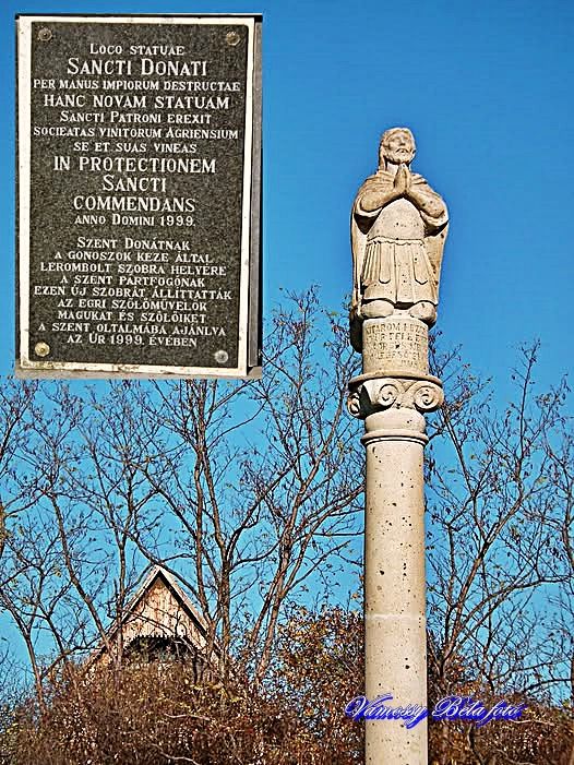 A szobrot gróf Erdődy Gábor egri püspök állíttatta 1716. július 12-én. Erről bejegyzés is tanúskodik szertartásnaplójában, melyet Szmrecsányi Miklós, jeles művészettörténész tett közzé egykor az Egri Népújság lapjain: „A püspök úr Ő excellenciája a székesegyházból körmenetet vezetett a városon kívül, Szent Dónátnak, a mennydörgés, a villámcsapás és elemi csapást hozó zivatarok ellen védő vértanúnak, újonnan felállított szobrához, melyet megelőző magyar és német szentbeszéd után szokásos szertartással megáldott.” Ettől kezdve Donát napja, „búcsú”-ja közel két és fél évszázadon keresztül volt az egyik legnevezetesebb ünnep, melyen részt vettek a „városi tisztikar” képviselői, a céhek, a szőlőmívesek széles tábora, néha pedig a közeli falvak lakói is. A cifra-hóstyai öregektől tudjuk, hogy e jeles nap előtt a Bajzáth ügyvéd birtokán dolgozó napszámosok, asszonyok feltakarították a szobor környékét „és szépen rendbe hozták a szőlőt. Erre az alkalomra — levéltári adatok tanúsítják — hogy egy sátrat állítottak fel, melyben fenyőgallyakkal díszített alkalmi oltárt készítettek. Amikor az éneklő sokadalom fellobogózva kiért a városból, a szobrot és a sátrat körbe állva végig hallgatta a misét, prédikációt. Majd imádkozott és könyörgött Donáthoz, hogy védje meg minden szőlejét, mezejét és házát a villám ütéstől, jégesőtől és forgószéltől. A XVIII. század közepén, a kivonulókat sípokból, trombitákból és dobokból álló zenekar kísérte. Ezért a muzsikusok — a város főbírája jóvoltából — rend szerint áldomást ihattak. Az egykori hiedelem szerint azért állították éppen a Cigléd-tetőre „Donát bácsi” szobrát, mert ott telepítették az első tőkéket. A legidősebbek ma is tudják, hogy régen „Szent Donát egy katona volt, a szőlők pártfogója, és azért állították a szobrát, hogy védje a szőlőt a jégtől meg a vihartól.” Tehát nem véletlenül került a szobor a Ciglédi dombtetőre. Egyrészt ez Erdődy idejében a püspökségé volt, másrészt viszont e terület felett jégesőzóna húzódik, ami azt jelenti, hogy nyáron gyakran szenvedett kárt. A cifrahóstyaiak szerint ráadásul a felnémetiek is „odaszorították” a jégfelhőket. Régen ugyanis vihar előtt szokás volt harangozni, s azt tették a szomszédos felnémetiek is, ezzel pedig — állítólag — a Cigléd felé terelték a felhőket. Ezért, hogy ezt megelőzzék, a servitáknál is időben elkezdtek a vihar közeledtekor harangozni. Szent Donát tisztelete más vonatkozásban is megnyilvánult még településünkön. Több egri harangot szenteltek fel nevében, ezzel is erősítve felhőeloszlató szerepüket. Valamikor a székesegyház harangjai között is volt több ilyen, melyeknek későbbi sorsáról nem tudunk semmi pontosat. A Minorita templom Donát-harangját azonban ma is hallhatjuk nap mint nap, amely 1834-ben készült, és palástján egy térdeplő Szent Donát, római légionárius ruhás domborműve látható. A szobor közelében, az út mentén napjainkig áll egy „gazdátlan” kőkereszt. Ennek helyén már a XVIII. század végétől áll feszület, legutóbb, 1888-ban Neumajer János, Eger város egykori főbírójának hozzátartozói újíttatták meg. Ezt ma mindenki csak úgy ismeri: „Donát-kereszt”. A szentről neveztetett el a Dónát temető kápolnája is. A múlt század végén a cifraiak erősen szorgalmazták az egykori, elhanyagolt „katonatemető” újbóli használatbavételét, helyén egy kápolna építését, mert hosszú ideje a fertálybeliek más temetőkben voltak kénytelenek örök nyugalomra helyezni hozzátartozóikat. Beadványaikban többször szerepelt az az elképzelés is, hogy a kápolna Donát tiszteletére szenteltetne fel, és elkészülte után a júliusi körmenet ehhez vezetne, nem pedig a kissé rangon alulinak tartott, sátor alatt felállított alkalmi oltárhoz. Végül felépült, mint Ludányi Antal apát-plébános fogadalmi kápolnája. Egyik mellékoltárán Szent Donát püspök látható egy szőlőtőkével. A kép Sajóssy Alajos, jeles egri egyházi festő műhelyéből került ki. Művelődéstörténetünk egy villanásával, Szent Donát szőlőhegyi védőszent tiszteletével próbáltuk megismertetni az olvasót, pusztán azért, ha hallunk róla földrajzi neveket, tudjuk és sosem felejtsük el, mily fontos szerepet játszott egykor Eger és más történelmi borvidék szőlőmíveseinek életében. Talán, ha egyszer majd jobb időket élünk, sikerül az egri patrónus szobrát rendbe hozatni, és ha nem is az eredeti helyén, de valamilyen állandó kiállításon újból megtekinthető lesz a város egyik legkorábbi barokk szobra.