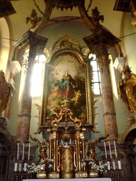 A szentély a magyar barokk templomok közül az egyik legszebb és legnagyobb oltár-architektúrával rendelkezik. Félgömb alakú baldachin zárja az oltárt felülről, olyan minha önállóan lebegne a térben. Jobbról Szt Joachim, balról Szt. Anna óriási méretű aranyozott szobra áll, Steinhauser József alkotása.
