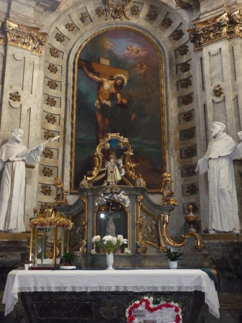 Krisztus a keresztről lehajol az előtte térdelő szenthez. 1930-ban festetteKacziány Aladár. Jobbra Szt. Domonkos, balra Assisi Szent Ferenc szobra áll.