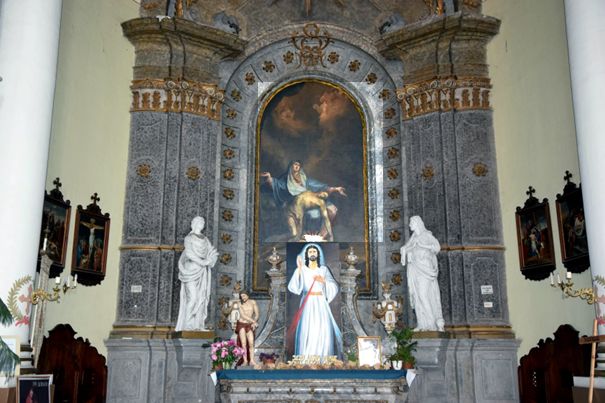 Piétát ábrázoló kép széttárt karú Máriát ábrázolja, ölében Jézus teste, tragikus hangulatot sugall. Háttérben angyalok. Festette Zirckler János egri festő, Kracker János Lukács segédje, műhelyének örököse.