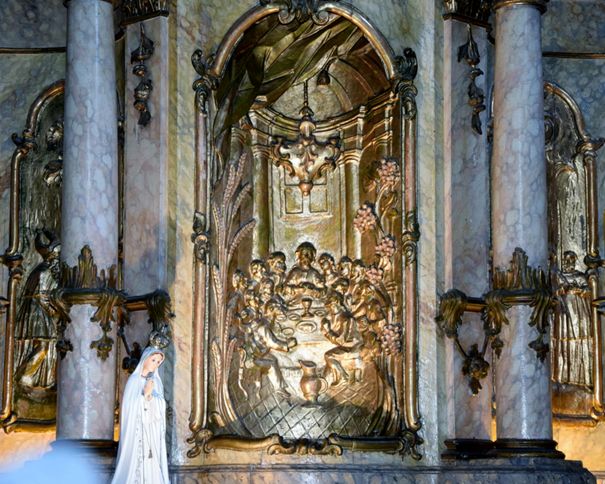 A tabernaculum ajtaján az utolsó vacsora aranyozott domborműve látható. Fölötte lebegő ezüst galamb a Szentlélek szimbóluma.