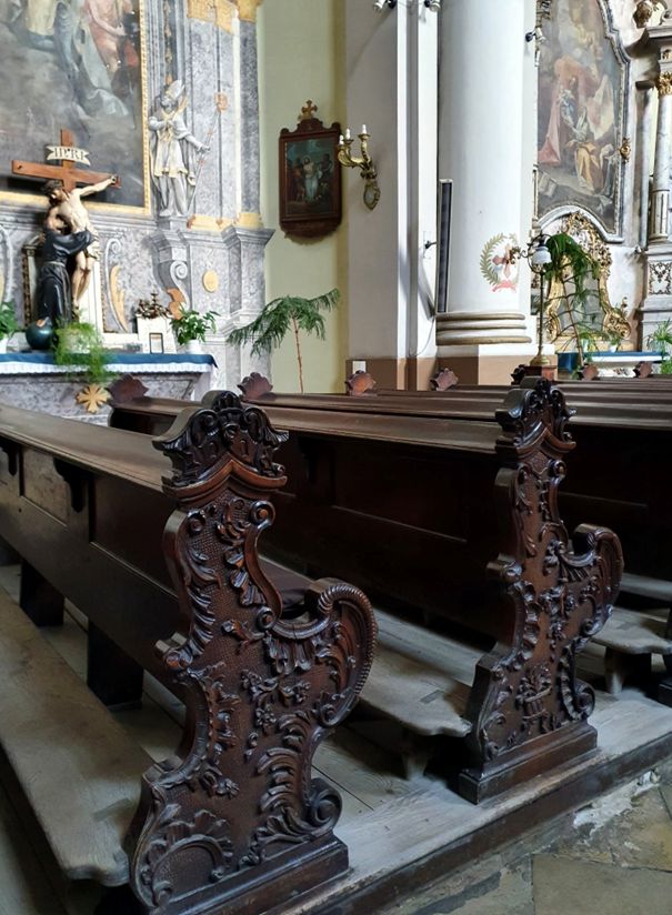 A padok nagy részét Joseph Stockerle minorita szerzetes faragta. Oldalfái asszimetrikus körvonalúak, nincs két egyforma pad a templombelsőben. Igen gazdag és változatos díszítésűek.