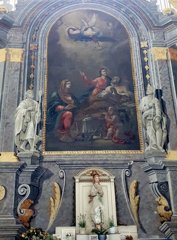 Oromzat felirata: SANCTE JOSEPHE ORA PRO NOBIS IN AGONE Szt. József halálos ágyánál Jézus látható, előtérben angyal szekercével. Keletkezése 1770-80 között. A kép két oldalán Szt. Rókus és Szt. Vendel