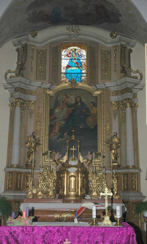 Belépve a templomba, jobbra Szt. János, balra Mária faragott és fehérre festett szobrát láthatjuk, Singer Mihály kitűnő munkája. A főoltár szintén fából van, arany és vörös színűre festett, virág-, levél-, csüngőfaragvány díszítésű. Jobbra Szt. László, kezében bárd, balra Szt. István, kezében koronát tartó, aranyozott karcsú szobrai állnak. (a bélapátfalvi Püspöky-mellékoltár mesterétől) A főoltárkép, amely Balkay Pál olaj-vászon festménye 1828-ból, Szt. János evangelistát ábrázolja. Az oltárkép felett Mária megkoronázását ábrázoló üvegfestmény van, ami a szentély megvilágosítását is szolgálja. A diadalív jobb oldalán lévő mellékoltár képén Szt. Pellegrint látjuk ima közben, Michel József átfestett műve. A diadalív bal oldalán Szt. Klára mellképe, kezében az eucharistia, előtte könyv és liliom. Mária-oltár: empire veretdíszes sárgára és fehérre festett fa. A tabernaculum fölött üveggel fedett fülkében van elhelyezve a Pieta kegyszobor. Két oldalon Szt. János evangelista és Mária csodálatos szobra látható. Gyönyörködtetnek az üvegablakok is, amelyeket Dürer-metszetek alapján Kopp üvegfestő készített.